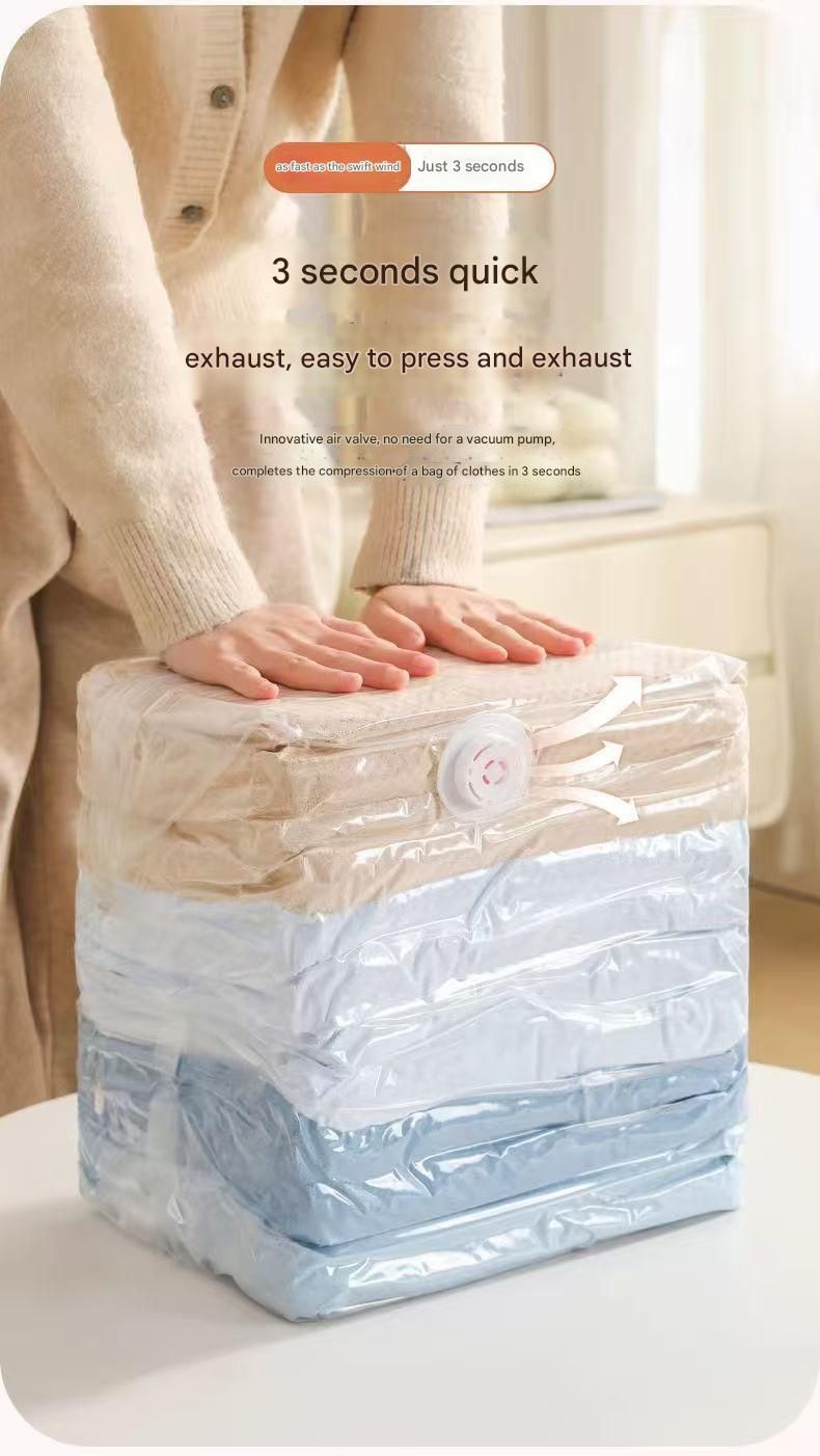 Innovative valve design eliminates the need for a vacuum pump! Simply fold your clothes/quilt into the bag, gently press, and the bag deflates and deflates in 3 seconds. Like magic, bulky items instantly become pancake-thin, saving time and effort. Even storage novices can easily slim down their wardrobes.