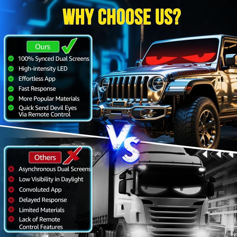 📦 Our full set includes everything for quick, easy installation—even for beginners:·2Pcs 24"X5" LED Matrix Panel (the core devil eye light)·Two 177 ft power cords (long enough for all car sizes)·Two rolls of red tape (strong adhesion, firm fixation on car windshields)·FREE Cigarette Lighter Car Charger