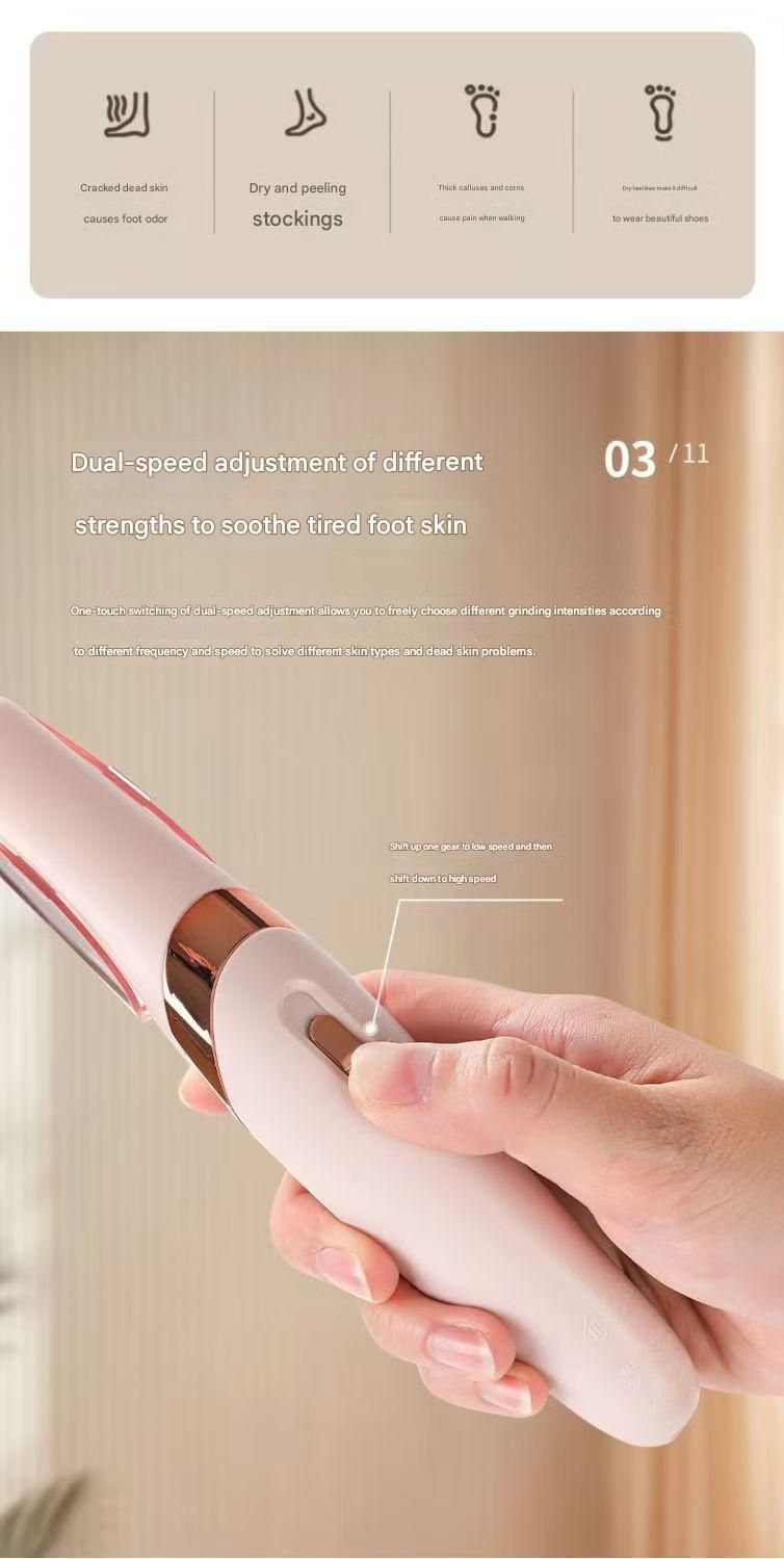 The low speed gently polishes the surface of dead skin, perfect for daily maintenance; the high speed effectively tackles stubborn calluses, allowing even those with thick calluses to refresh with a single click. Even beginners can easily switch between settings, eliminating the worry of "I didn't choose the right pressure, it hurts/it's ineffective."
