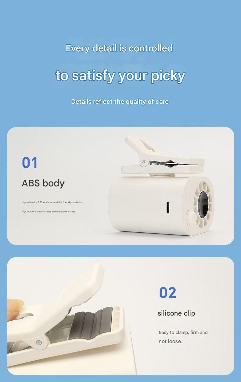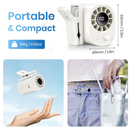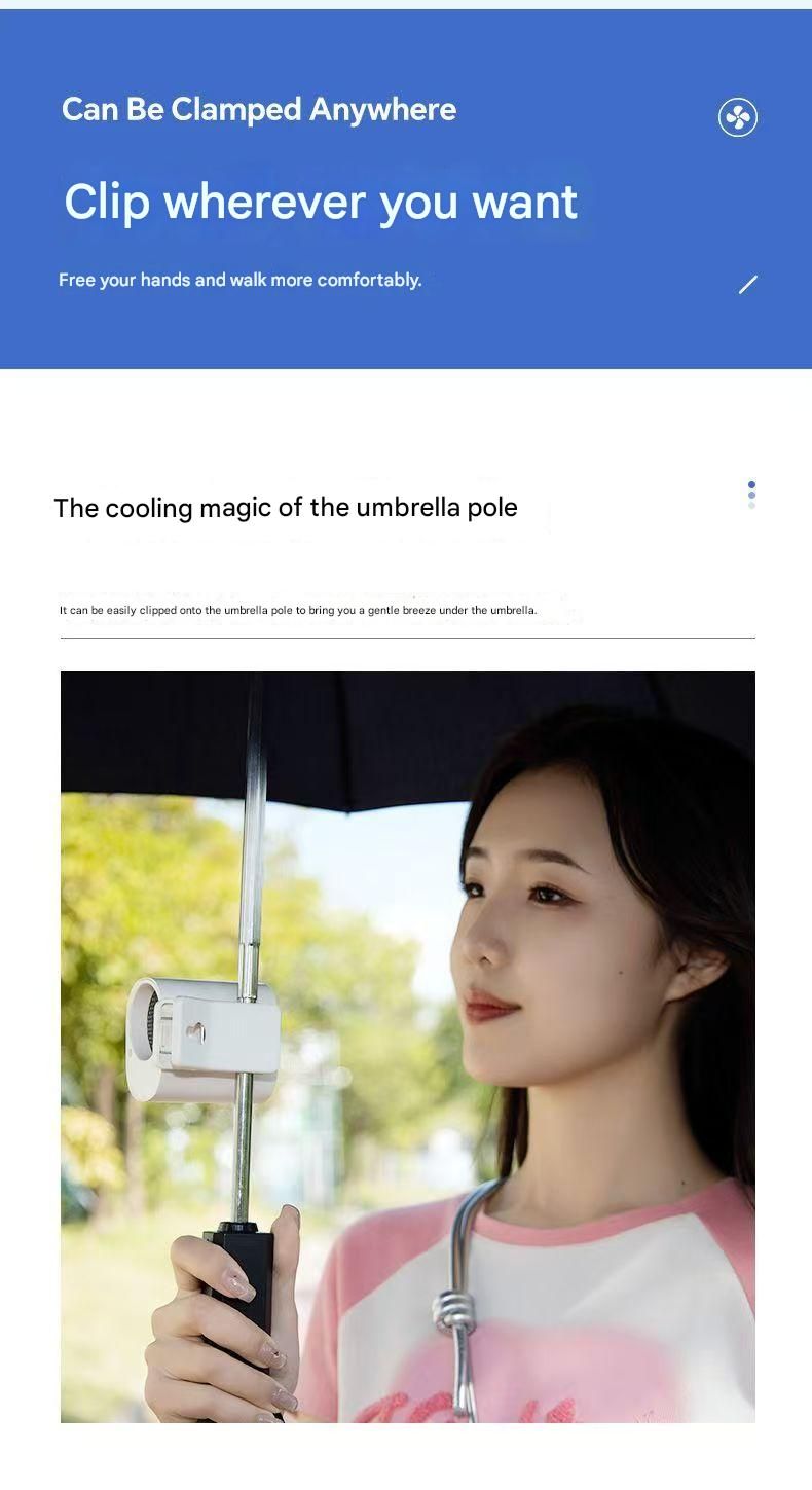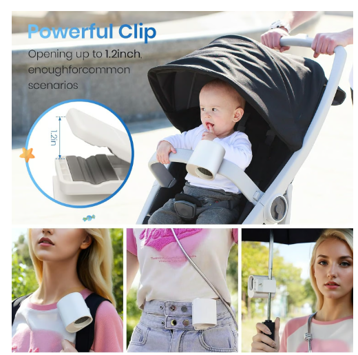 "Clip it anywhere you want," completely hands-free: The powerful clip has a wide opening and can securely hold anything from strollers and umbrella poles to backpack straps, waist belts, and even desktops. It can be used to hold handlebars while cycling, backpacks while shopping, and umbrella poles while setting up a stall. Do whatever you need, and let the cool breeze follow you!