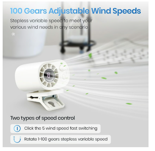 100 wind speed levels + 360° rotation delivers precise cooling air to your face: From a gentle breeze to a powerful gale, you can adjust the speed to any speed you want. The fan also rotates 360°, allowing you to blow air wherever you want, such as on your neck, face, and arms, to "blow away" the heat from all directions!