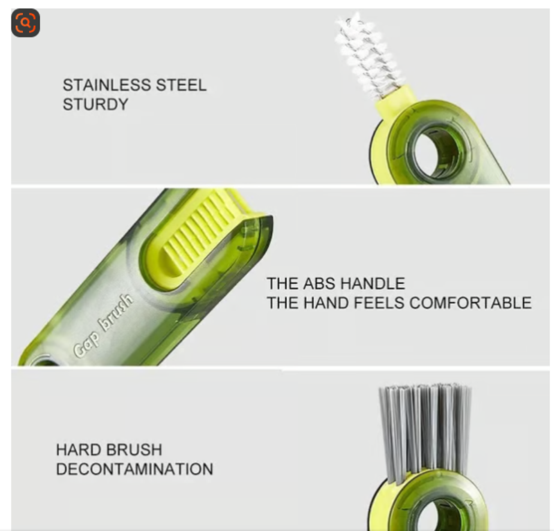 3-in-1 cleaning brush: U-shaped brush: match the cup mouth to clean stubborn stains around the cup mouth. ?Gap Brush: Clean the narrow grooves on the inner wall of the cup cover. ? Corner brush with hard bristles: Remove the dirt in the corner groove of the container.