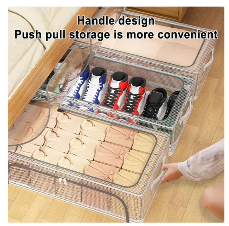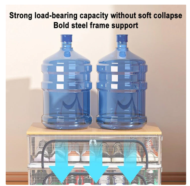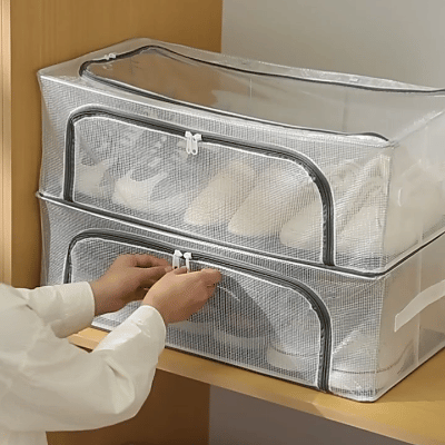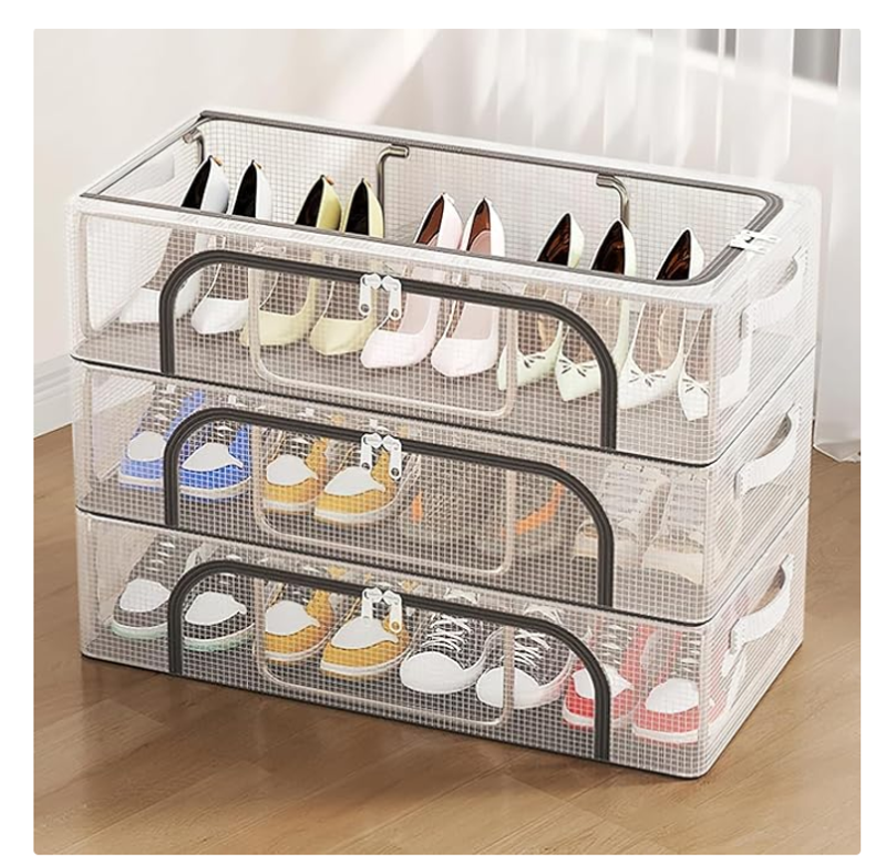 The large opening on the top of the shoe box makes it easy for you to place your shoes. When the shoe boxes are stacked, it is like a small shoe cabinet, and you can easily take out the shoes by opening the side zipper.