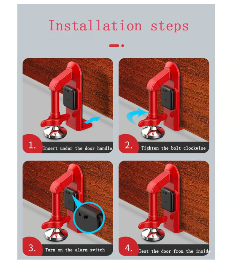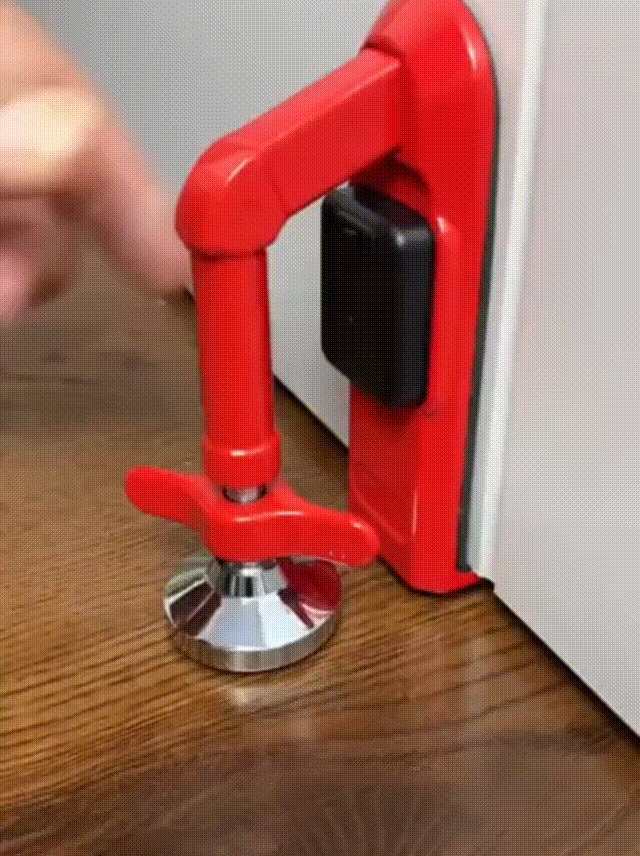 🚪【Easy to Install】No tools. It just takes a moment to fit in the gap under an inswinging door. Place the door lock stopper below the door handle directly, then adjust the foot to make it tightly grasp the ground. In an emergency, the quick-release removes the lockdown with an upward motion. Note: Testing the door ensure the door stopper is firmly fixed in position.