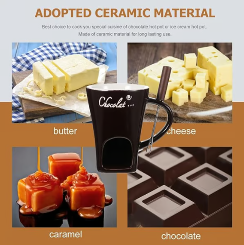 This 2-set ceramic fondue set includes mugs designed for melting chocolate, cheese, butter, and even wax or candy! Perfect for creating a variety of fondue treats or desserts for your family and guests.
