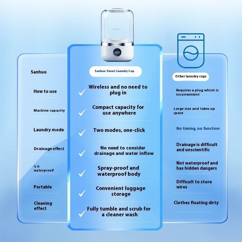 Say goodbye to bulky washing machines! The Wireless Portable Laundry Cup is your ultimate travel companion for fresh, clean clothes on the go. Compact, cordless, and powerful—this tiny washer gets the job done in minutes, whether you're in a hotel, camping, or just tight on space at home.