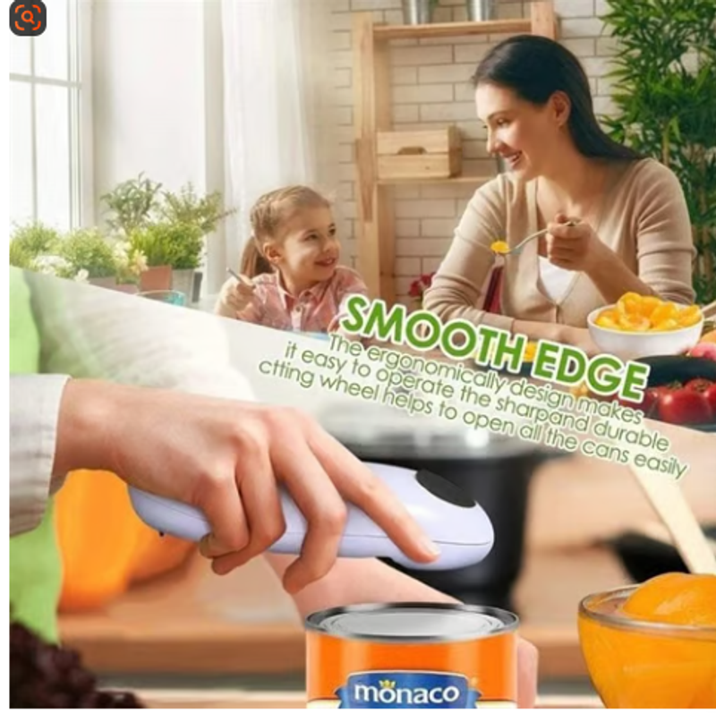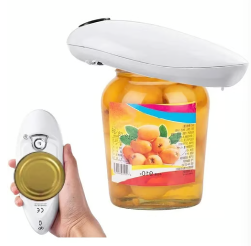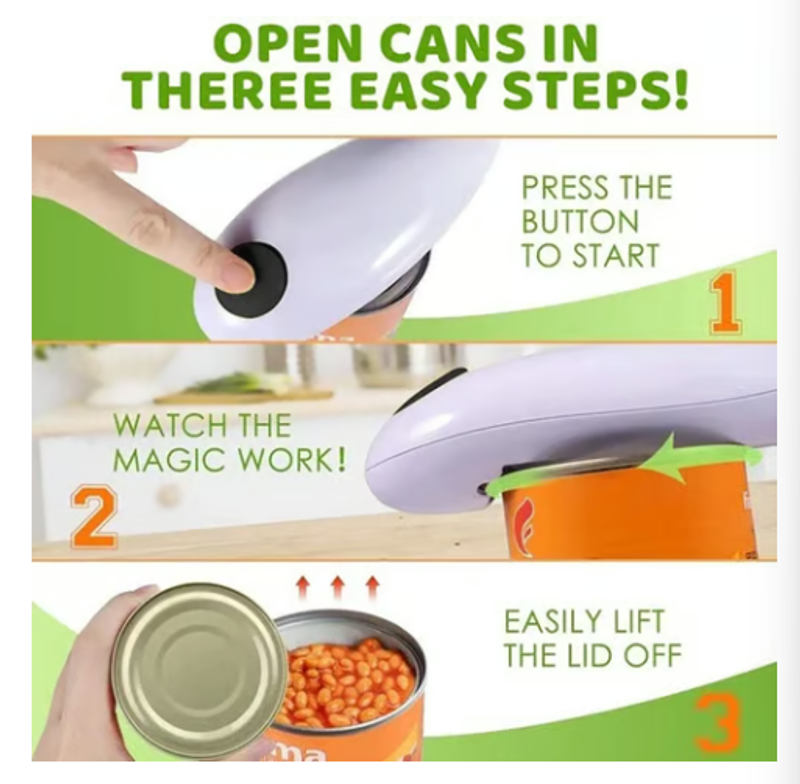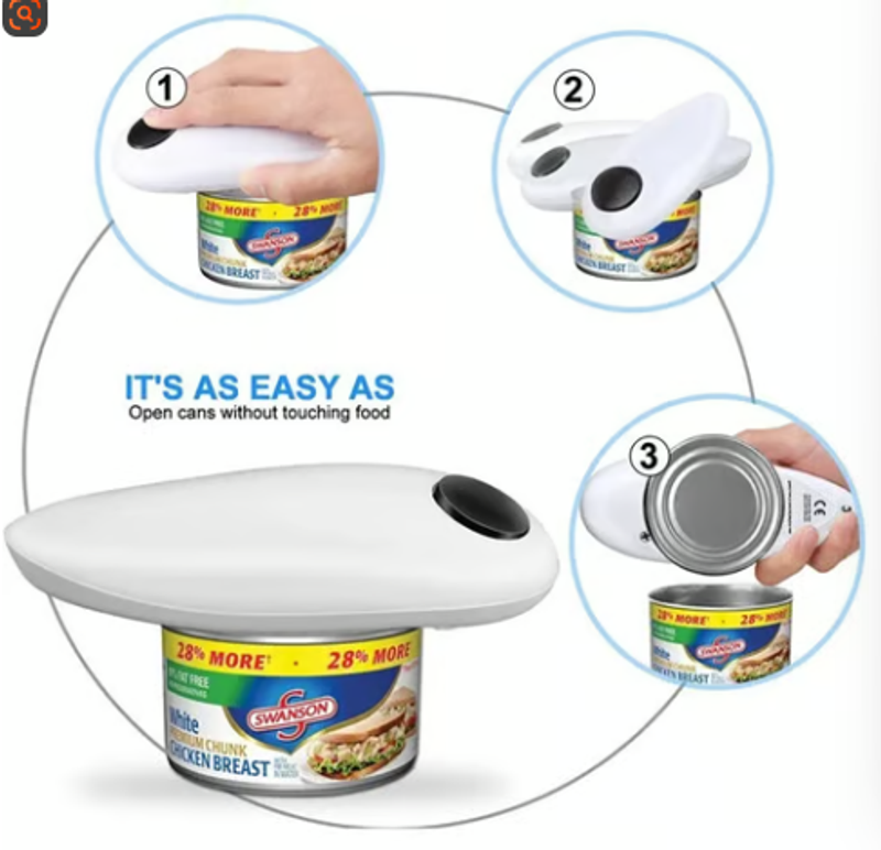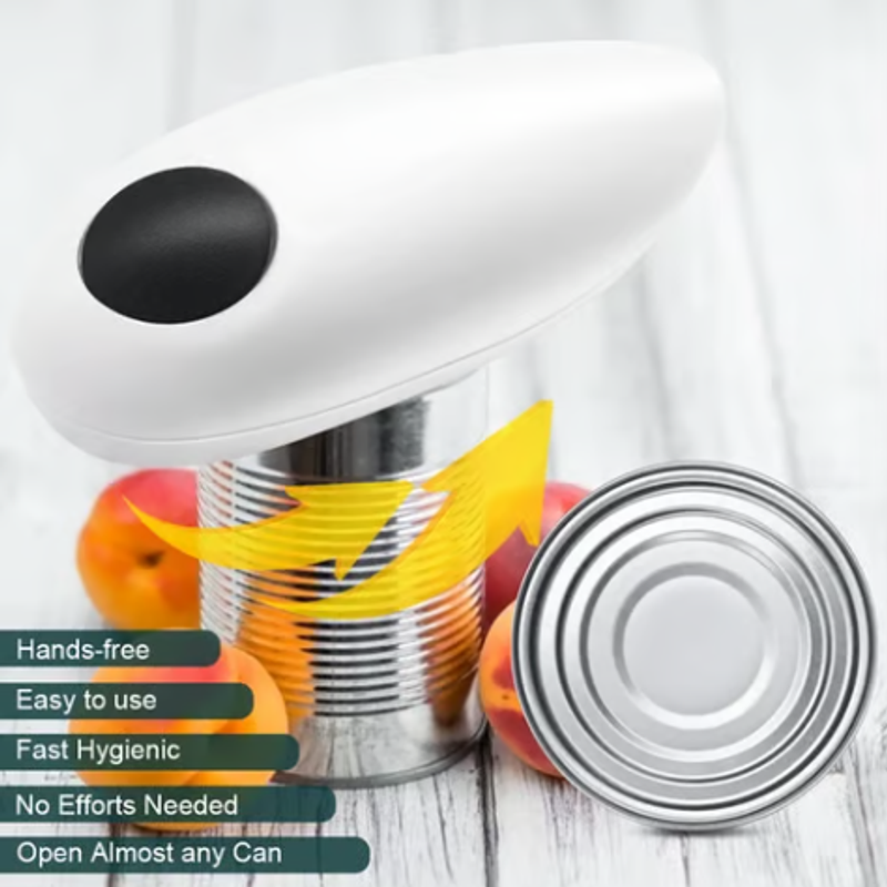 Two taps to open any cans with our electric can opener. Push the button to turn it on. It cuts cans 360° along the lid. Push the button again to stop.