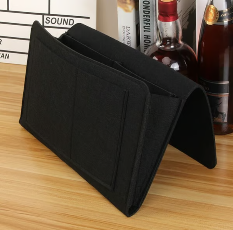 The high-quality 100% polyester felt caddy is ideal for convenient bedside storage. Store your phone, laptops, e-readers, tablets, books and remotes all at an arms length away for quick access. Secure your cords for convenient charging at night. Organizes items you frequently use to be readily accessible at your leisure. Never again will you have to get out of bed to reach a tissue, television remote, books, magazines, flashlights, medications, accessories and more. When not in use, the caddy collapses for storage. This organizer is perfect for rooms where storage is limited.