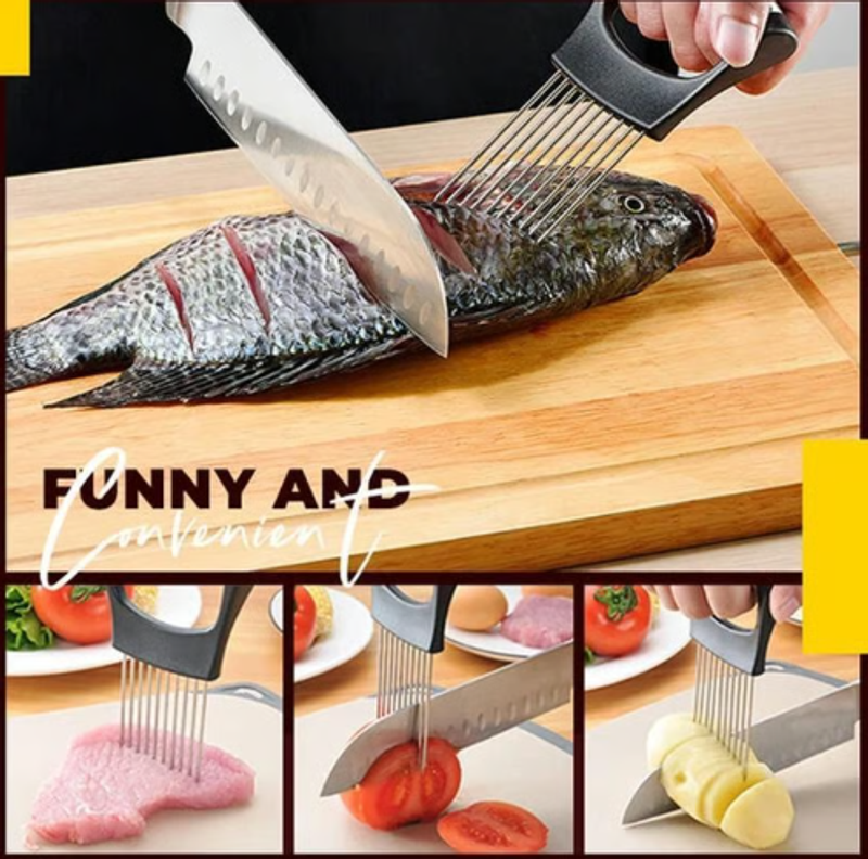 • 【Claim your time】The Onion Holderr for slicing save a lot of time for slicing or chopping onions. No more nasty cuts or using nails to hold onion. No more uneven slices or loosing tomato juice on cutting boards.