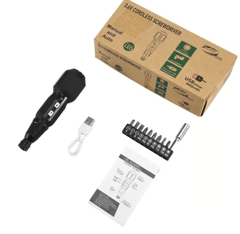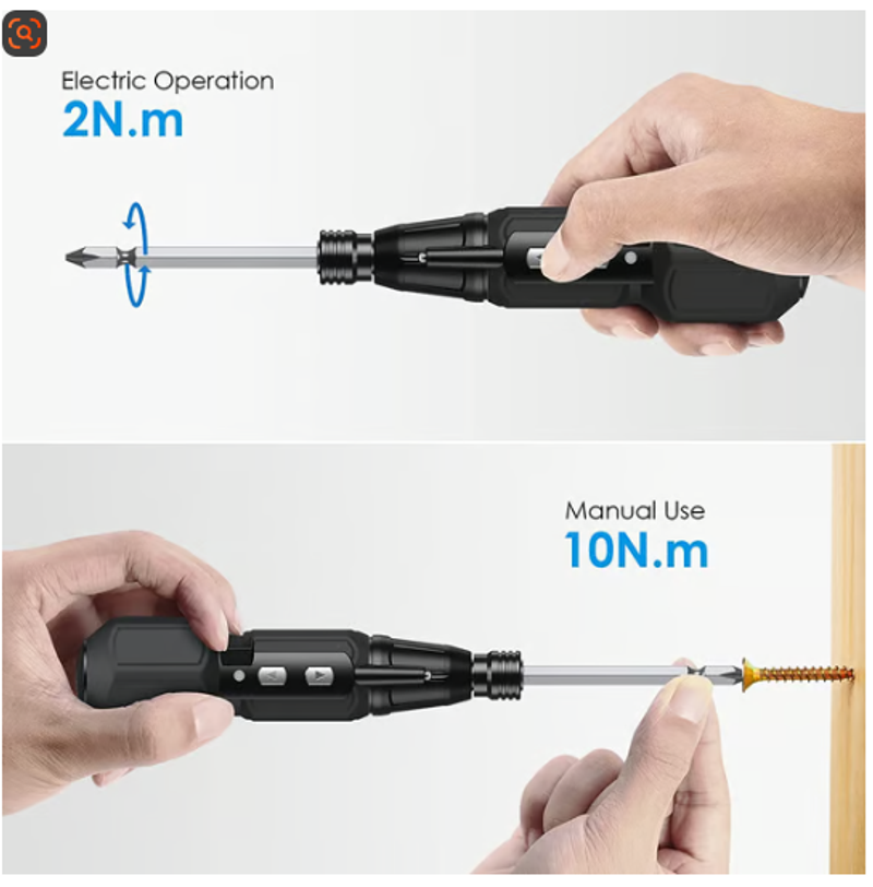 • 3,6 V Elektrische Schraubendreher mit Funktion 2 in 1. Das lineare Design in flexiblen Gummi ermöglicht dem Schraubendreher, sowohl elektrisch als auch manuell zu bedienen. Das Werkzeug verfügt über ein maximales Drehmoment von bis zu 2 nm, wenn Sie elektrisch und bis zu 10 nm arbeiten, wenn Sie manuell arbeiten.