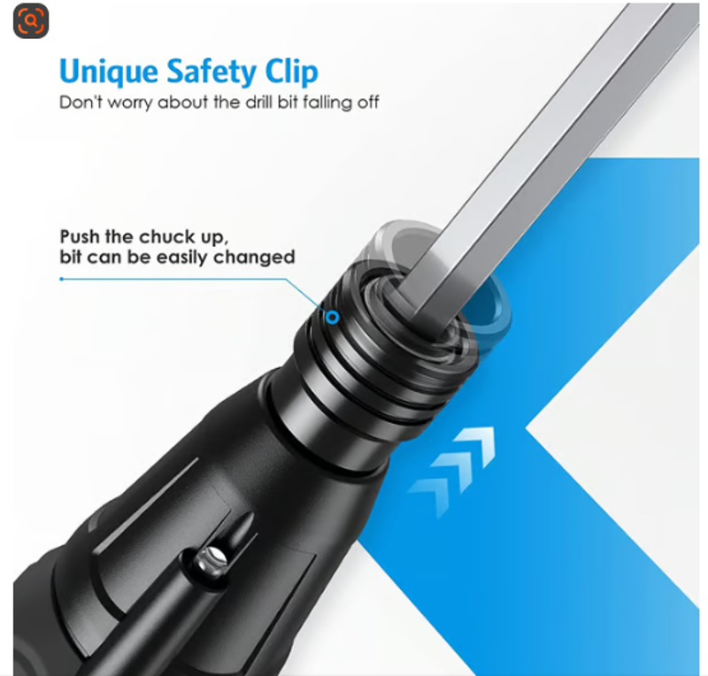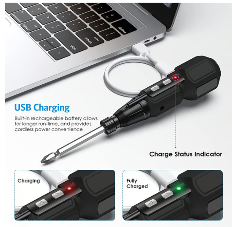 • Der drahtlose Schraubendreher umfasst einen integrierten LED -Workfire und eine wiederaufladbare Batterie. Automatisches LED -Licht beleuchtet die kleinen dunklen Bereiche in den Ecken. Darüber hinaus unterstützt dieser drahtlose Schraubendreher die USB -Last. Nach 1 Stunde Last kann es 80 Minuten lang ununterbrochen funktionieren