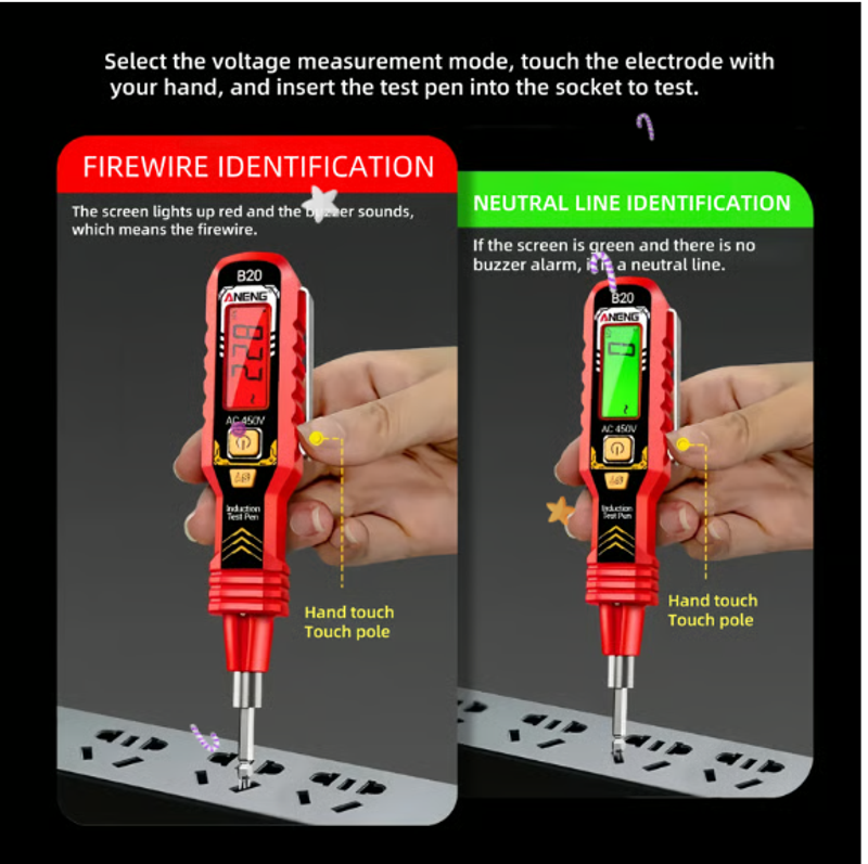 Live/Neutral Wire Detection: Switch to voltage mode for easy wire recognition: insert into the socket while touching the sensor — red screen and beeping sound = live wire, green screen with no sound = neutral wire.