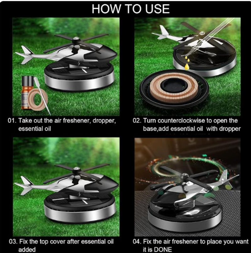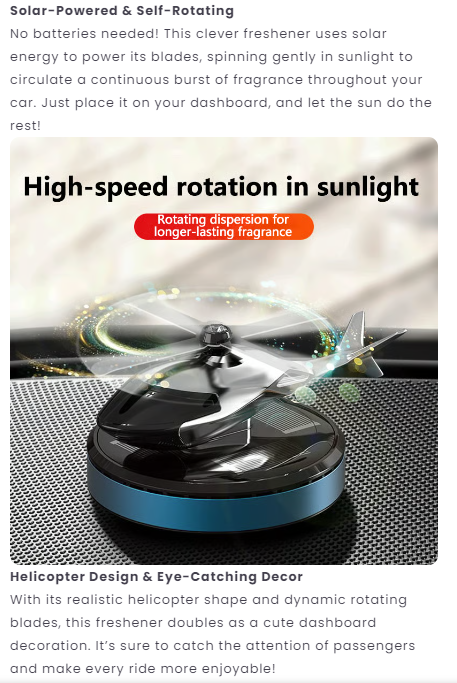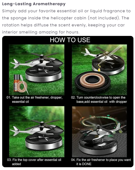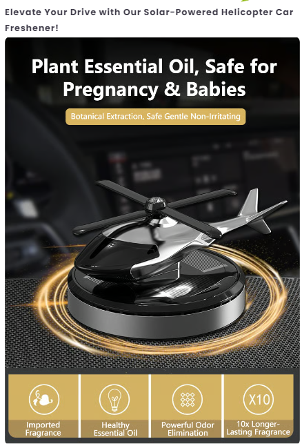 Tired of boring car interiors and stale air? Meet ourHelicopter Shaped Car Air Freshener-a fun, functional,and eco-friendly accessory that keeps your car smellingfresh while adding a playful touch to your dashboard!