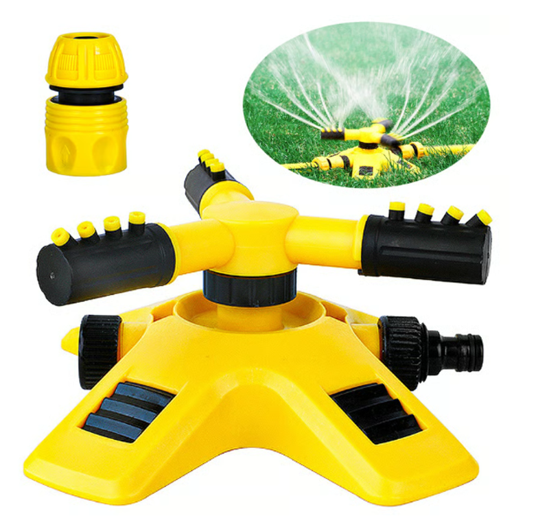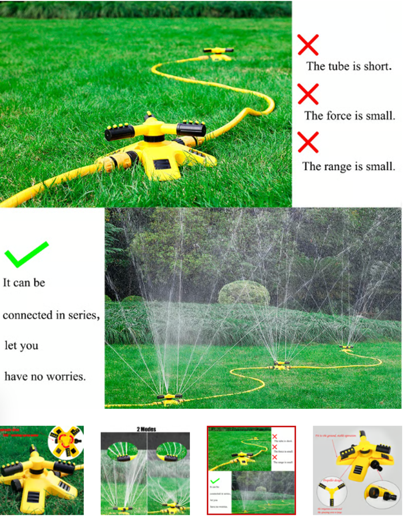 Spray water evenly: Like a propeller, this sprinkler has three spray rods, each irrigation rod has four different angles of water outlet, precision calculation, each water outlet at different angles to spray to different corners, make the water more uniform, covering a large area.