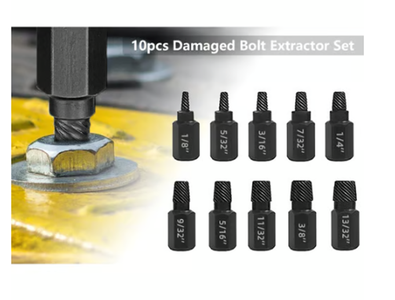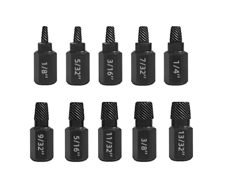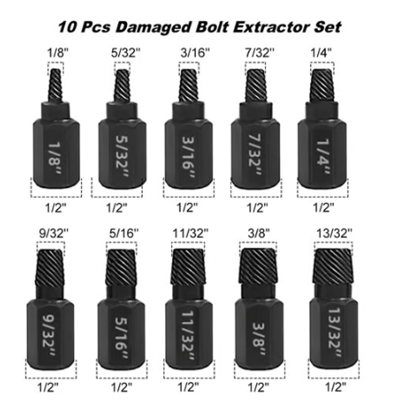 This Bolt Extractor Set includes a range of sizes from 1/8 inch (3.5mm) to 13/32 inch (10.3mm), with increments of 1/32 inch.
