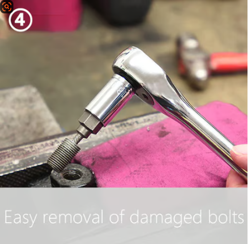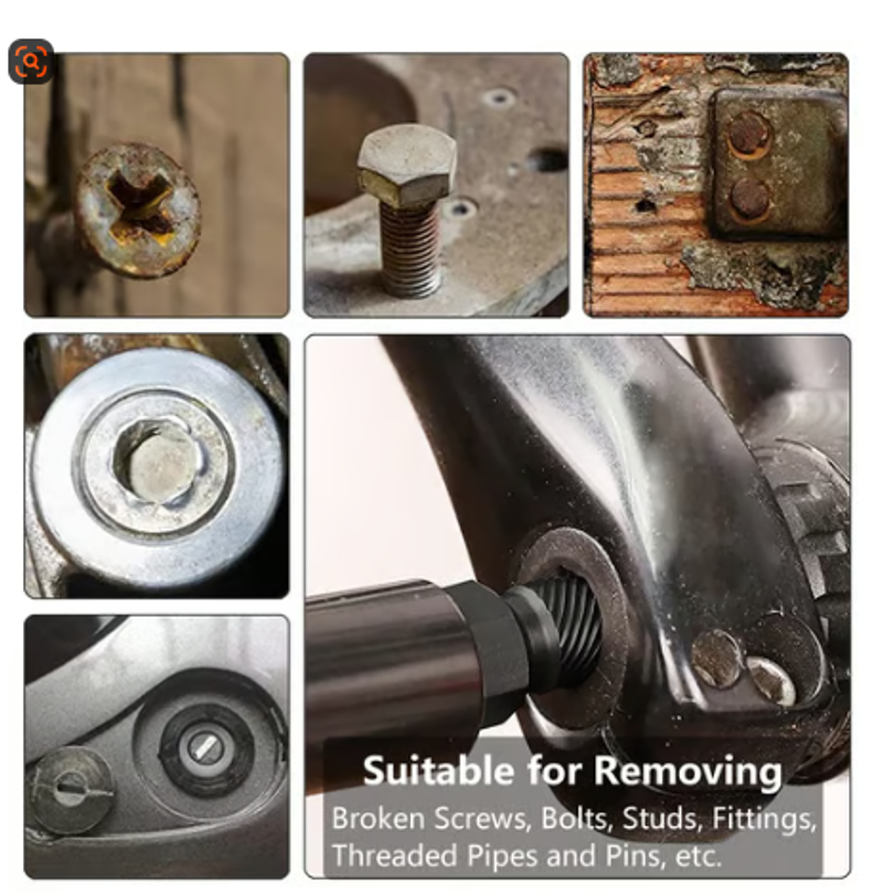 This extractor set is an ideal tool for removing broken screws, bolts, studs, fittings, threaded pipes, and pins. Additionally, it can be used in conjunction with a hexagonal drill bit to expand its range of applications. Whether for automotive repairs, garage projects, construction sites, or home renovations, these extractors are widely applicable.