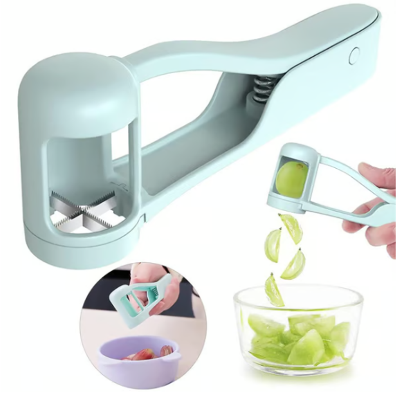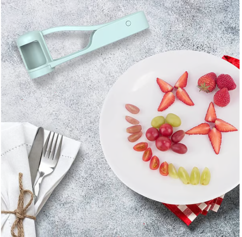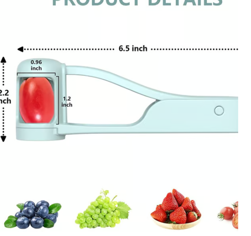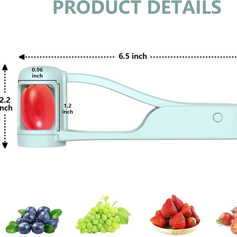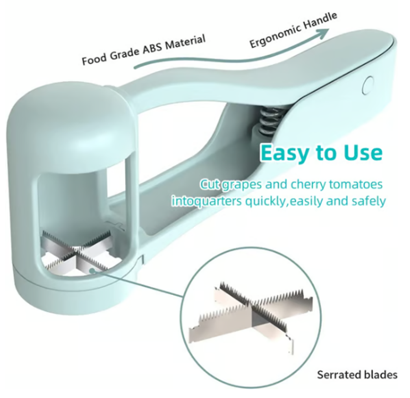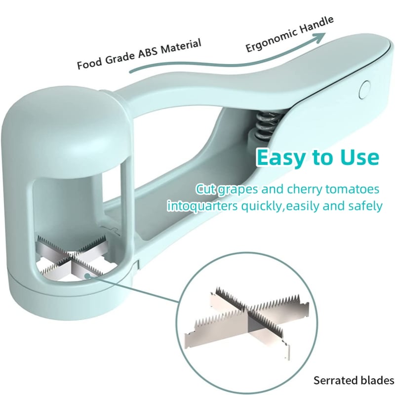 Cross-shaped serrated blades perfectly cut grapes/tomatoes into 4 even pieces