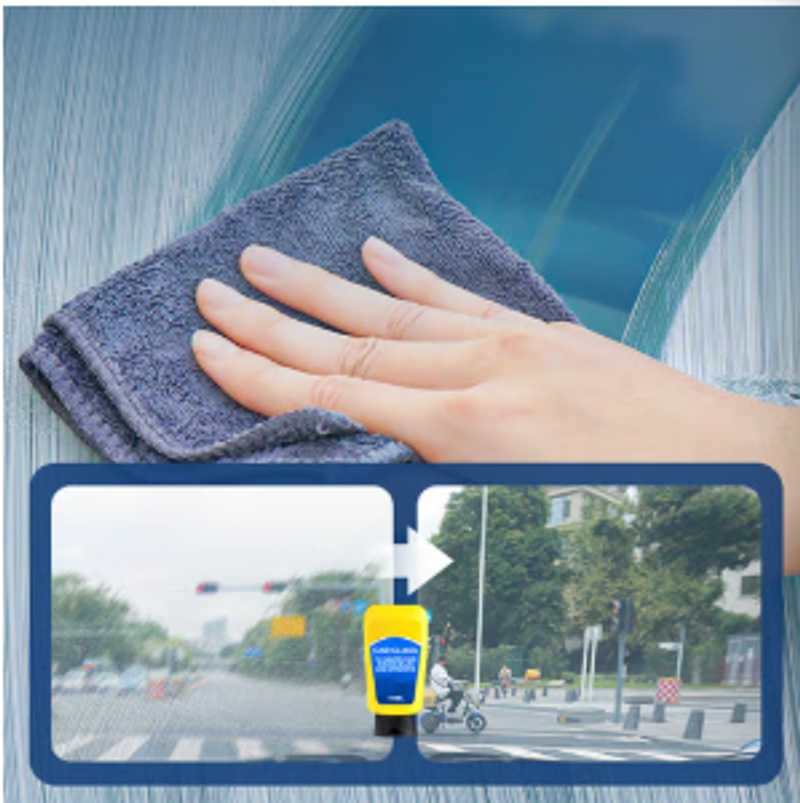 Glass Oil Film Remover effectively removes oily substances from car windshields, providing a clearer, unobstructed view even in rainy weather.