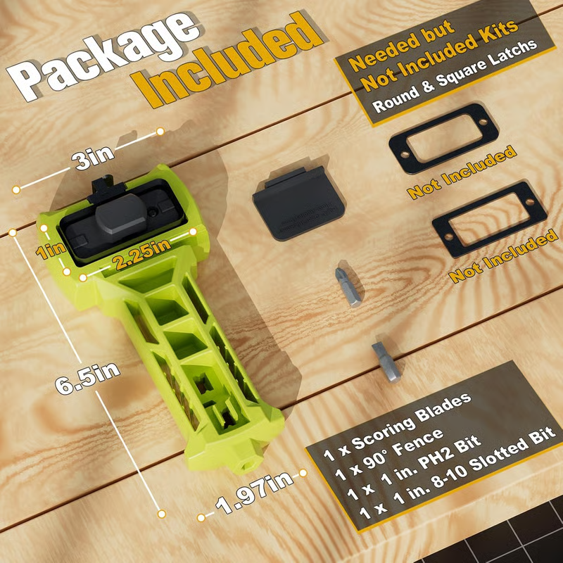 Built-in chisel and driver bits complete the job: score the face, rout the mortise, then drive the latch in place.