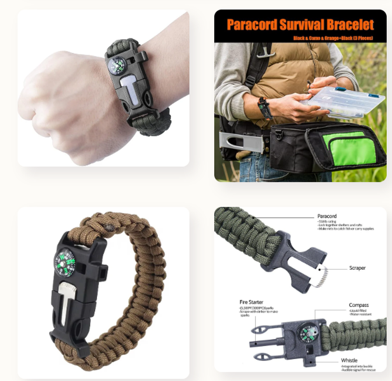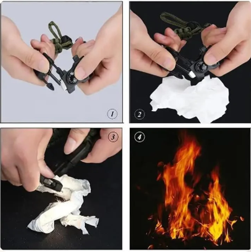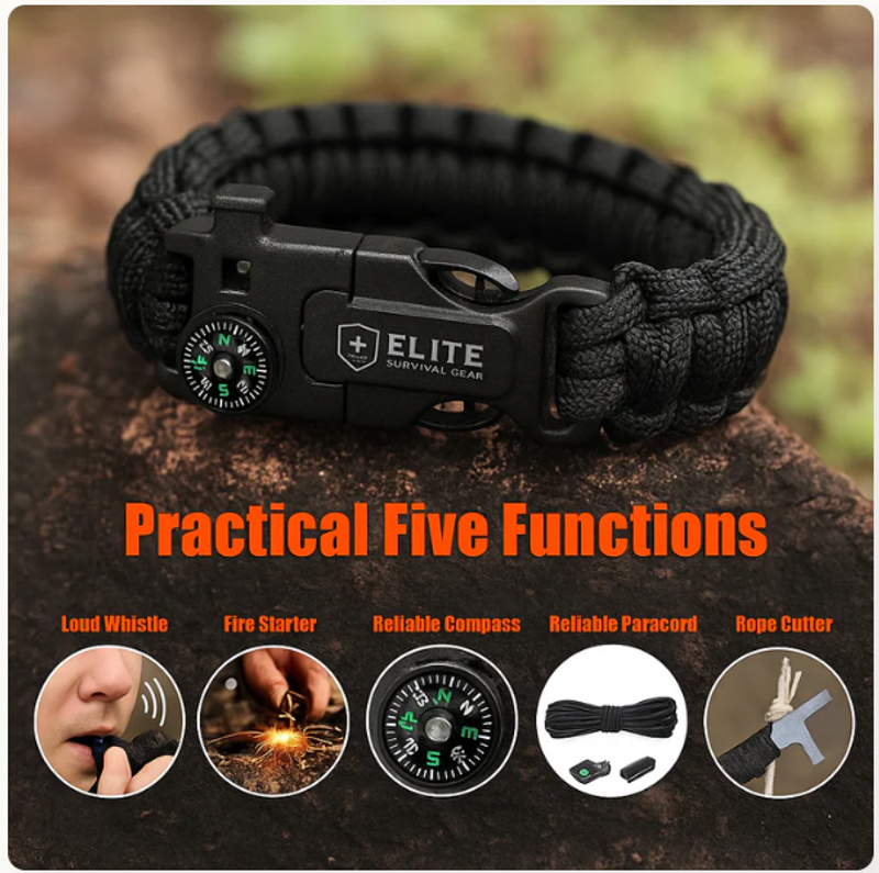 knowing you have the right tools to handle unexpected challenges. Key features include: - **Multifunctional Design**: Integrates a compass, whistle, fire starter, scraper, and adjustable paracord into one sleek bracelet, eliminating the need for bulky gear. - **Durability**: Crafted from super-strong military-grade materials, ensuring reliability and longevity, even in harsh conditions. - **Adjustable Fit**: Easily customizable to accommodate various wrist sizes,