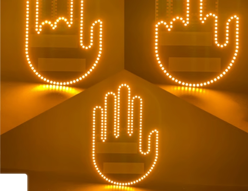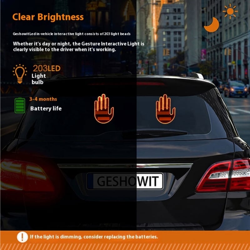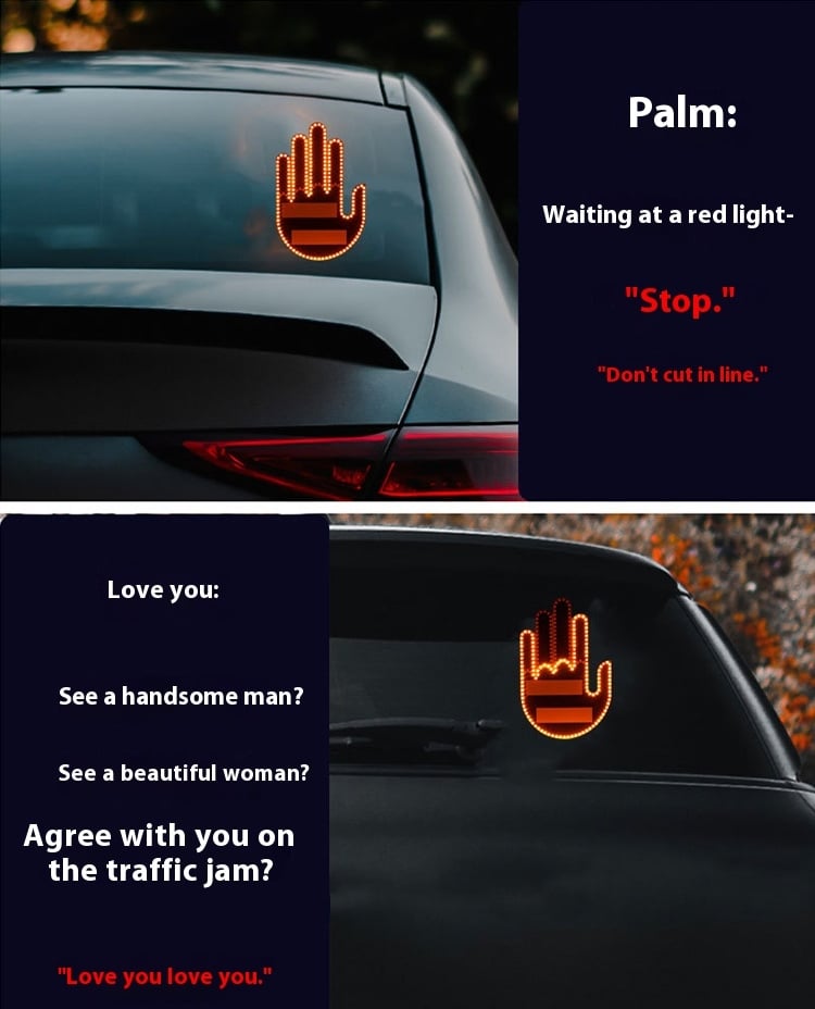 : Eye-catching palm signals warn tailgaters to keep safe distance, reducing risk of rear-end collisions.