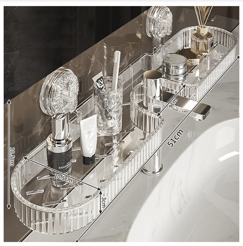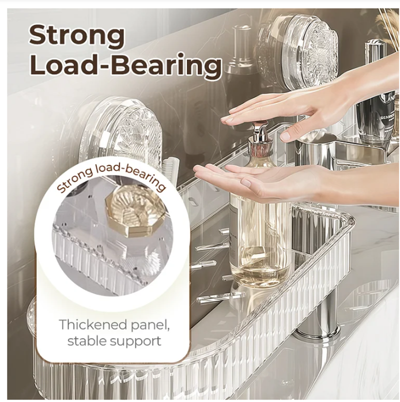 STRONG LOAD-BEARING DESIGN: Made with thickened and widened panels, this faucet storage rack offers excellent load-bearing capacity. Its sturdy construction holds large bottles and toiletries securely, while guardrails prevent items from falling, keeping your sink area organized and safe.