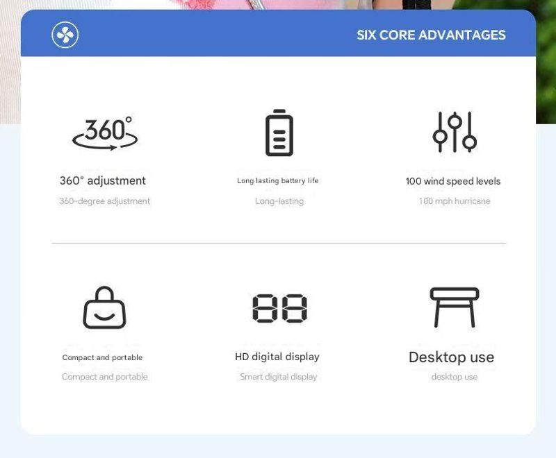 100 wind speed levels + 360° rotation delivers precise cooling air to your face: From a gentle breeze to a powerful gale, you can adjust the speed to any speed you want. The fan also rotates 360°, allowing you to blow air wherever you want, such as on your neck, face, and arms, to "blow away" the heat from all directions!
