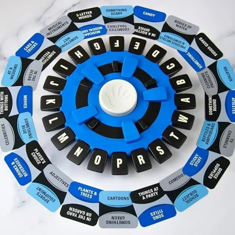 Take a category card from the deck and choose a category for the round. To start a round, announce the category and press the timer button in the center of the wheel. When it's your turn, you have 10 seconds to give an answer for the category that begins with an available letter on the wheel.