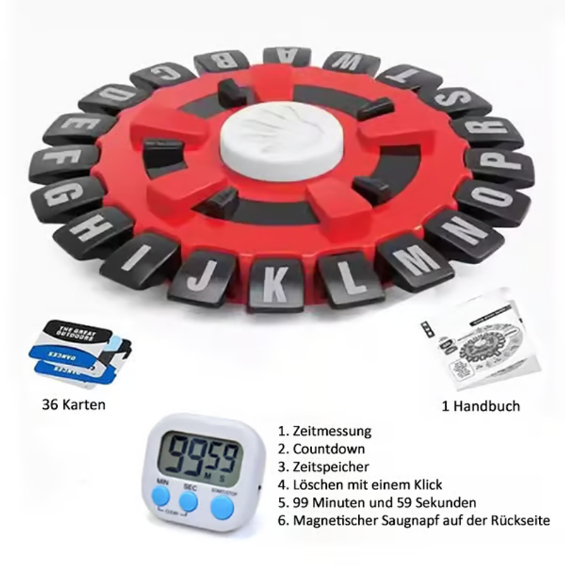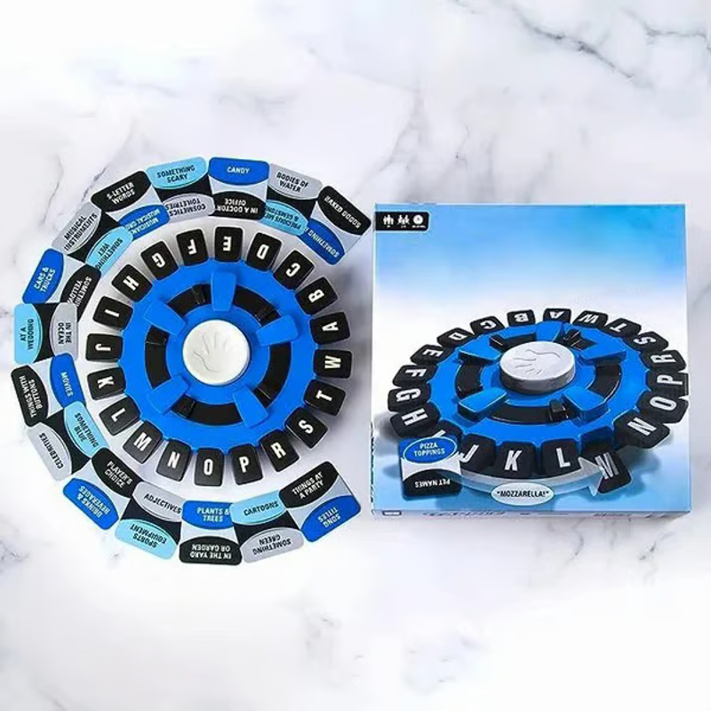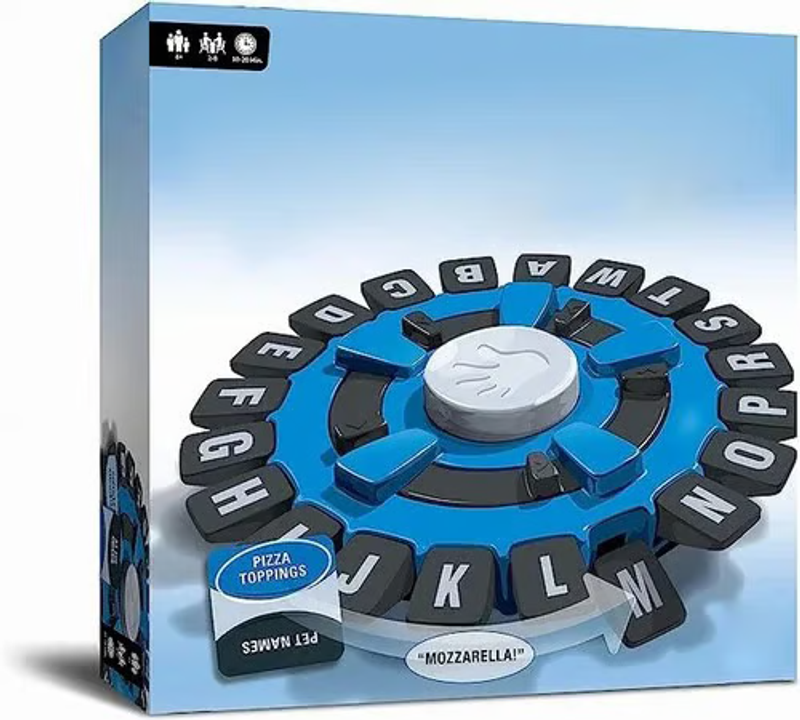 This fast-paced word game gives players a thrill as they compete against each other to beat the clock! Challenge friends and family to tap the letters on the portable wheel while finding words for different categories before the ten-second timer runs out! Simply say a word, beat the time, and win!