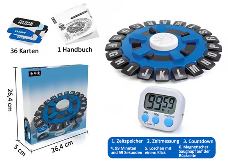 This product includes 1 wheel and 36 cards (144 categories). The basic set does not include a timer.