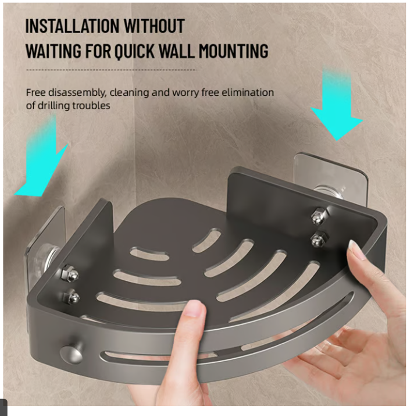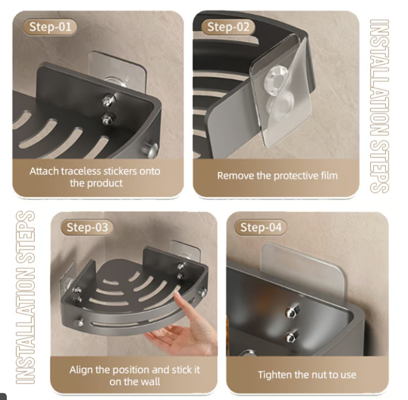 Note: The adhesive installation is suitable for smooth hard surfaces such as ceramic tiles, smooth marbles, glass, metal, and solid wood. The corner of the shower shelf is only suited for the 90-degree corner, not suited for a rounded corner.