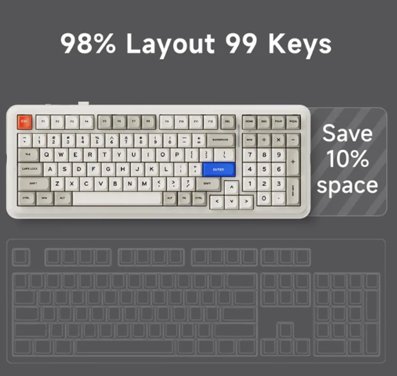 Featuring a compact 98% layout with 99 keys, the MCHOSE K99 V2 combines a refined gasket-mounted structure with six layers of sound-dampening padding for crisp keystrokes. With tri-mode connectivity and dynamic RGB lighting, it delivers a seamless typing experience that inspires creativity. Built for gamers, typists, and creators who demand speed, comfort, and customization.
