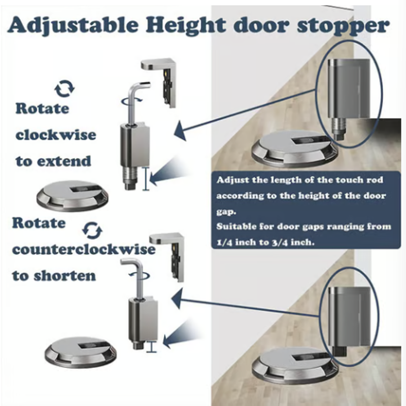 This door stopper is highly versatile, with an adjustable touch bar that accommodates door gaps up to 2cm in height. It’s designed to be compatible with various door types, including heavy-duty doors and narrow door frames. Whether for your home, office, or commercial space, this stopper meets a wide range of needs, providing a practical solution for any environment.