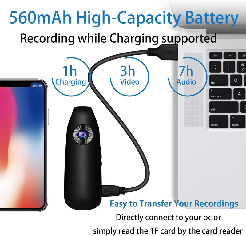 The small camera design powered by 560mAh rechargeable lithium battery that lasts up to 180 minutes recording time. It supports loading while recording. By plugging the mini camera into the portable power bank, you can use it for as long as you want.