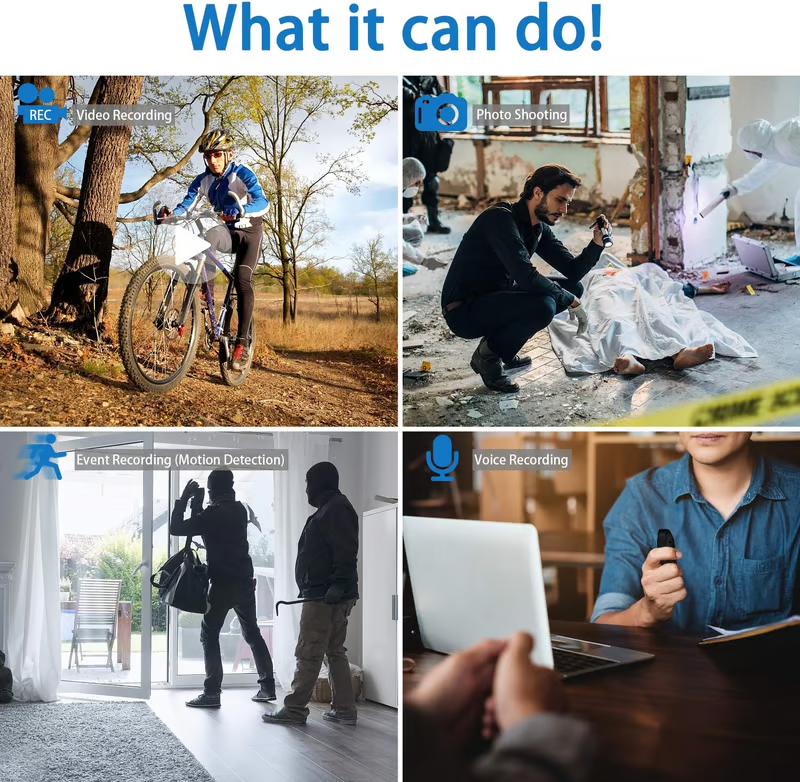 Equipped with loop files function, multi modes: support video/photo meets your different requirements. One button control is easy to use and configure, Ideal for travelor, the police, company, and bouncer for indoor and outdoor use.Can be used almost anywhere, whether at home, in the office, in the warehouse,In the corner of the backyard or the store.