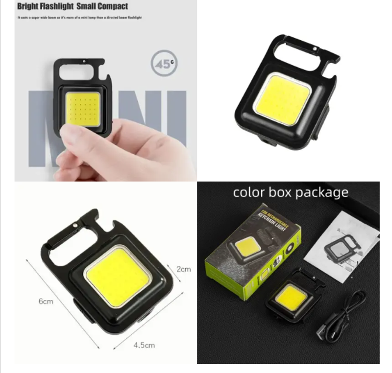 Material: aluminum alloy + PCSize: 6×4.5x2cmLight source type: 30 COB wicksProduct brightness: 500 lumensBattery capacity: 200mAh polymer lithium batteryLighting time: 4 hours (highlight 1.5 hours)Charging method: Type-c chargingLighting mode: strong light – medium light – flash – long press super brightApplication scenarios: open the door at night / invites a dog for a walk / power failure emergency / troubleshooting, etc.