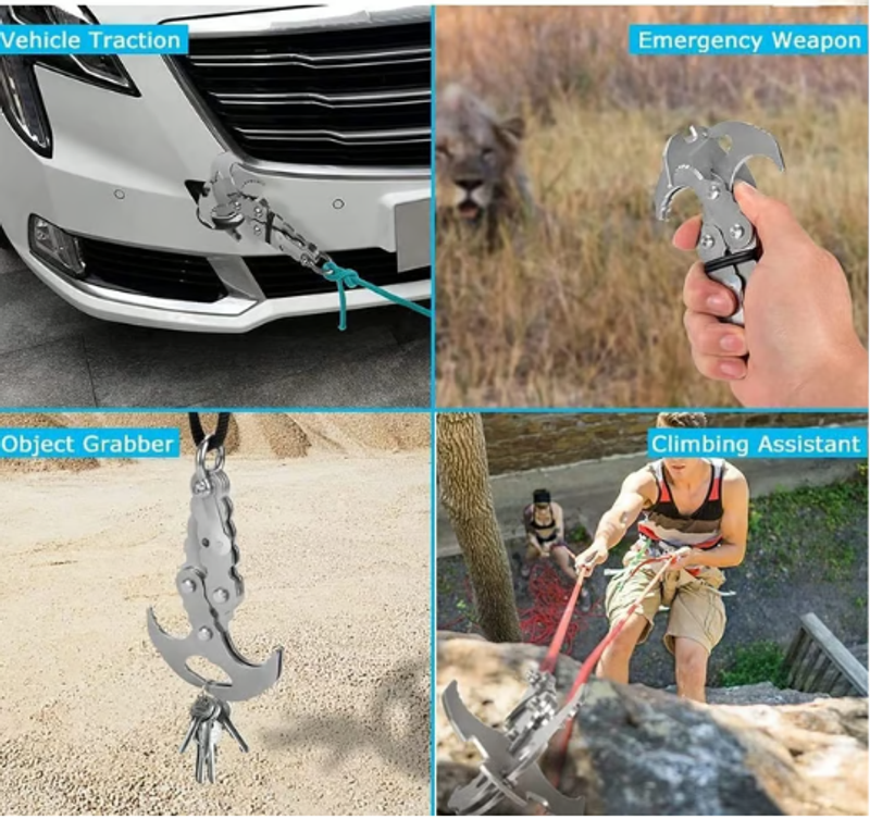Our hook is an essential tool that can be used for everything from opening bottle caps to being used as an emergency weapon. With a strong rope, you can use it in a variety of scenarios, including camping, hunting, pulling cars, and more.