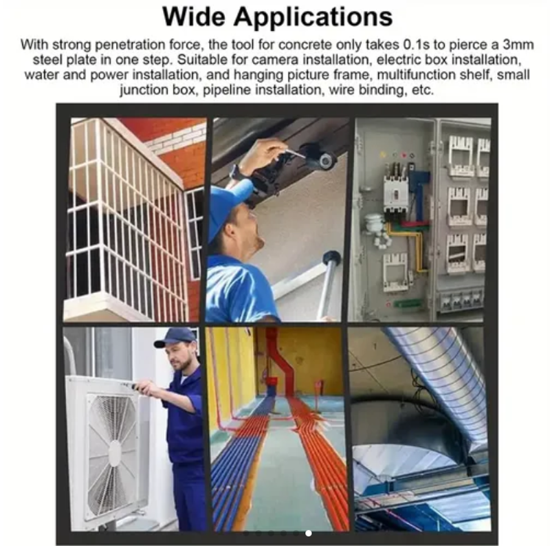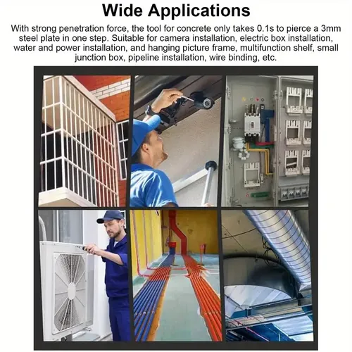 Wide Applications: With Strong Penetration Force, The Tool For Concrete Only Takes 0.1s To Pierce A 3mm Steel Plate In One Step. Suitable For Camera Installation, Electric Box Installation, Water And Power Installation, And Hanging Picture Frame, Multifunction Shelf, Small Junction Box, Pipeline Installation, Wire Binding, Etc.