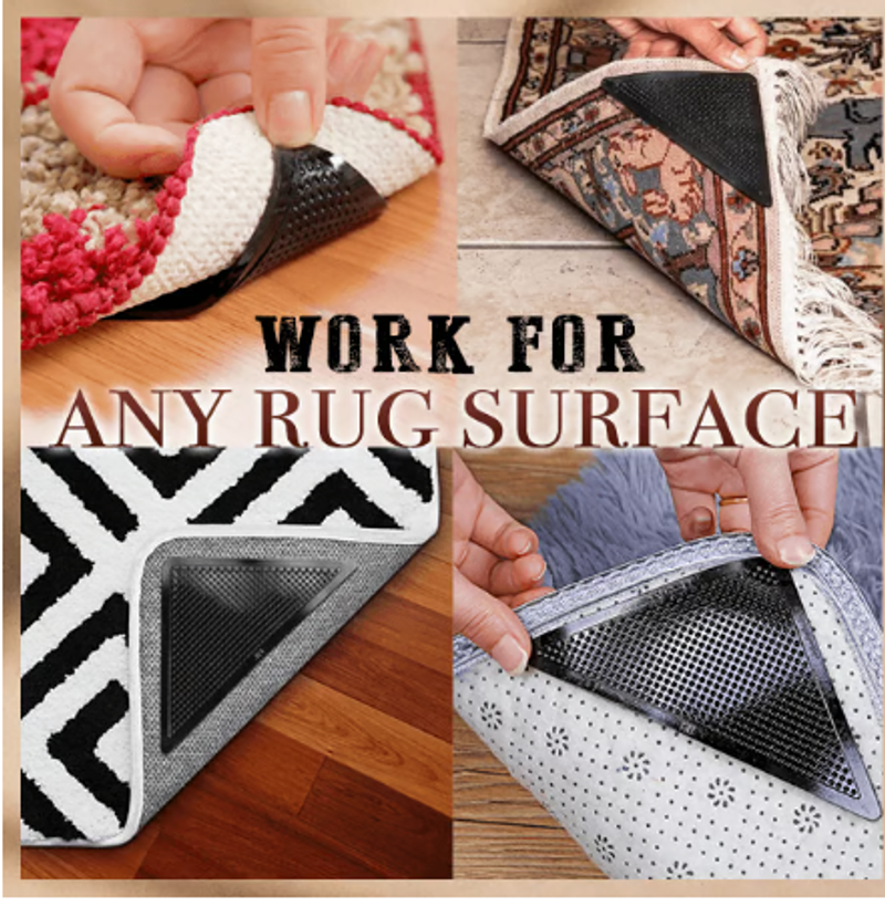 These grippers are made of non-slip silicone gel pads in triangular shape, perfectly fit carpet corners. Strong adhesion keep carpets firmly in place and flat! Solves all annoying carpet problems including curling, sliding, folding and pet zommies. Never worry about affecting the luxurious appearance of carpets - They’re totally invisible under the rugs with ultra-thin design!