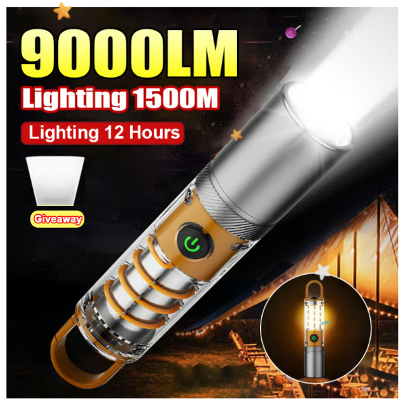 Powered by advanced high-efficiency LED chips, this flashlight delivers up to 100,000 lumens of brightness with a maximum beam distance of 2 kilometers. The rechargeable battery provides 3 hours on high mode or up to 6 hours on low mode, with 6 adjustable brightness levels to match any situation. Perfect for emergencies, household use, camping, hiking, or outdoor adventures.