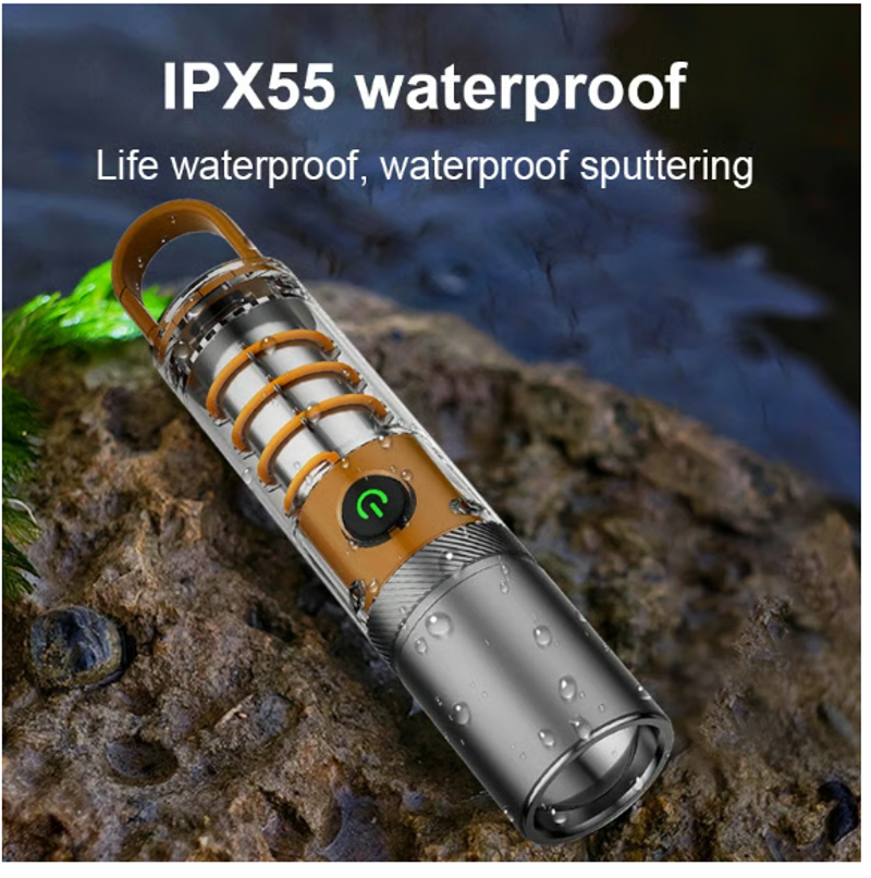 With an IPX5 waterproof rating, this flashlight can withstand rain, splashes, and wet outdoor conditions—making it a dependable companion in all weather. ⚠️ Note: Not designed for underwater use.
