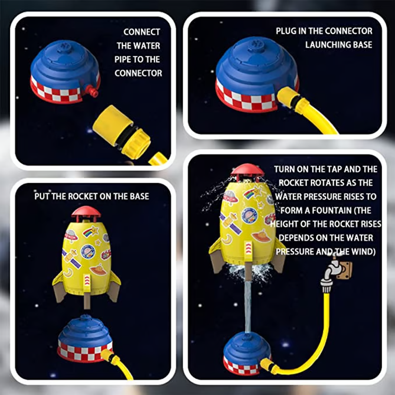🚀[Sprinkler Rocket] Attach a garden hose to the thrust controller to raise and balance the rocket on a stream of water. Once balanced the rocket just where you want it, water sprays from the rocket nose cone to wet those brave enough to run under the rocket.