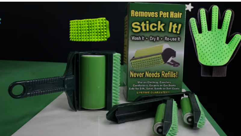 Introducing our Stick It Pet Hair Removal Roller! It's a washable and reusable roller that easily removes pet hair from clothes and furniture. Just roll it over the surface! It's like a handheld roller, but with a stick!