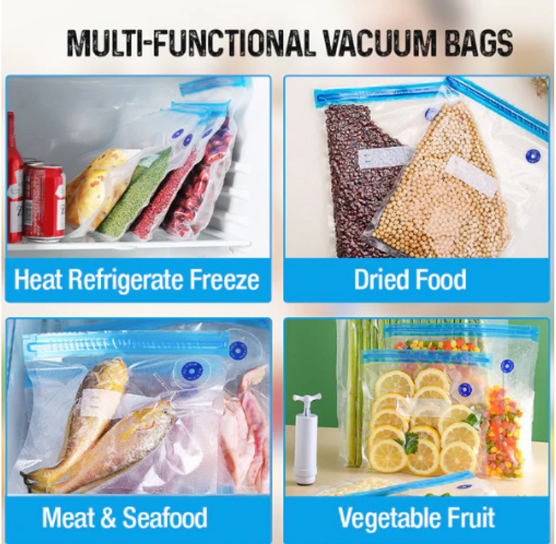 Multifunctional use - Vacuum bags are excellent for food storage. They can be used for meat, seafood, vegetables, fruits, cereals, nuts and sandwiches. Vacuum storage helps keep food fresh for longer.