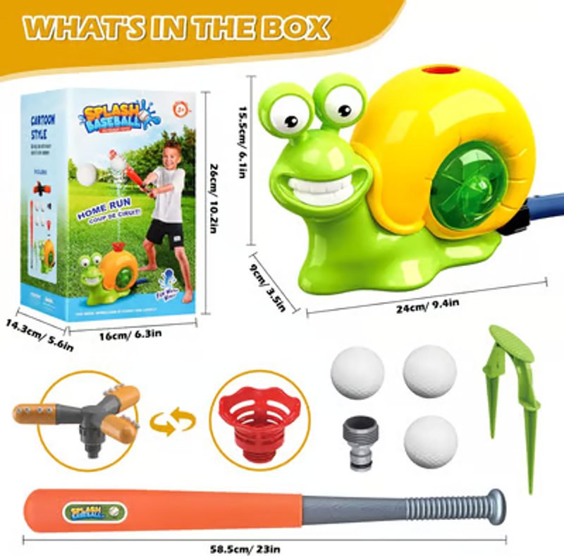The sprinkler baseball toy is an ideal summer gift for boys and girls ages 3 4 5 6 7 8 9 10 11 12. The water sprinkler toy set includes: 1 * snail sprinkler, 1 * water column nozzle, 1 * 360° rotating nozzle(2 in 1 Sprinkler Baseball Set does not include), 1 * retractable baseball bat, 4 * baseballs, 1 * ground stake. The snail's appearance design is interesting and attractive, which can immediately attract children's attention. Get ready for a summer of water play and baseball fun!
